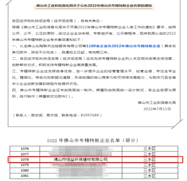 近日,佛山市工業(yè)和信息化局公布“2022年佛山市專精特新企業(yè)擬入庫名單”,佛山市恒益環(huán)保建材有限公司憑借在加氣塊行業(yè)領(lǐng)域“創(chuàng)新、專注、精進(jìn)”的突出表現(xiàn)成功上榜,喜獲2022年佛山市“專精特新”企業(yè)榮譽(yù)。