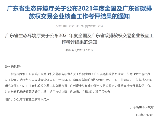3月24日,廣東省生態(tài)環(huán)境廳發(fā)布《廣東省生態(tài)環(huán)境廳關(guān)于公布2021年度全國及廣東省碳排放權(quán)交易企業(yè)核查工作考評結(jié)果的通知》(粵環(huán)函〔2023〕101號),在全省40家核查機(jī)構(gòu)中,節(jié)能減排中心作為佛山市唯一一家碳核查機(jī)構(gòu),2021年度核查工作總評結(jié)果為“優(yōu)”,這是節(jié)能減排中心連續(xù)第二年被評為優(yōu)秀碳核查機(jī)構(gòu)。