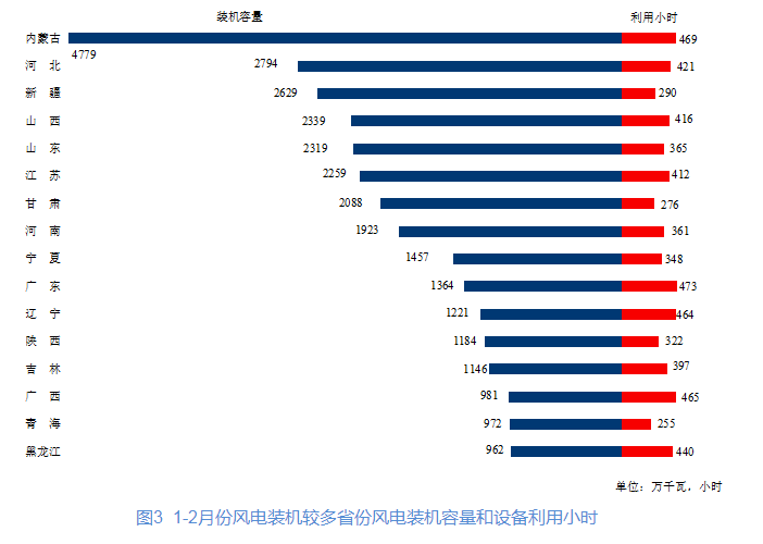 分類型看,1-2月份,全國水電設(shè)備平均利用小時為364小時,比上年同期減少45小時。在水電6000千瓦及以上電廠發(fā)電裝機(jī)容量排前10的省份中,除廣東、四川、云南外,其他省份水電設(shè)備平均利用小時均同比減少,其中,湖南、貴州、廣西、湖北減少超過100小時,分別減少409、231、188和105小時;全國火電設(shè)備平均利用小時為720小時,比上年同期減少39小時,其中,燃煤發(fā)電設(shè)備平均利用小時為760小時,比上年同期減少36小時,燃?xì)獍l(fā)電設(shè)備平均利用小時為360小時,比上年同期減少38小時。分省份看,全國有17個省份的火電設(shè)備平均利用小時超過全國平均水平,其中四川、新疆、重慶、青海和甘肅超過900小時,分別為979、977、924、922和918小時。與上年同期相比,21個省份火電設(shè)備平均利用小時同比減少,其中江西、上海、安徽減少超過100小時,分別減少167、129、109小時;全國核電設(shè)備平均利用小時1209小時,比上年同期增加14小時;全國并網(wǎng)風(fēng)電設(shè)備平均利用小時401小時,比上年同期增加78小時;全國太陽能發(fā)電設(shè)備平均利用小時182小時,與上年同期基本持平。
