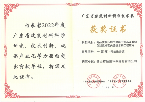 近日,廣東省建材行業(yè)高質(zhì)量發(fā)展會(huì)暨廣東省建筑材料行業(yè)協(xié)會(huì)第五屆一次會(huì)員大會(huì)在佛山舉行。恒益環(huán)保建材公司項(xiàng)目成果“高品質(zhì)蒸壓加氣混凝土制品及其綠色制造成套關(guān)鍵技術(shù)和工程應(yīng)用”被授予“廣東省建筑材料科學(xué)技術(shù)獎(jiǎng)一等獎(jiǎng)”稱(chēng)號(hào)!與此同時(shí),還獲得了“綠色制造優(yōu)秀企業(yè)”“科技創(chuàng)新優(yōu)秀企業(yè)”“質(zhì)量標(biāo)準(zhǔn)品牌建設(shè)先進(jìn)個(gè)人”等多項(xiàng)集體及個(gè)人榮譽(yù)。