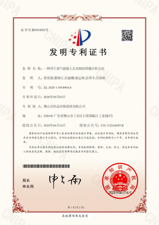 近日,從國(guó)家知識(shí)產(chǎn)權(quán)局傳來(lái)喜訊,恒益環(huán)保建材申報(bào)的“一種用于加氣混凝土孔結(jié)構(gòu)的圖像分析方法”獲得國(guó)家知識(shí)產(chǎn)權(quán)局頒發(fā)的發(fā)明專利證書。