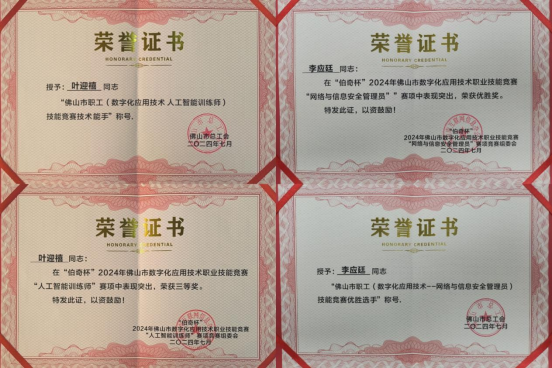 公司參賽員工也獲得多項(xiàng)殊榮。葉迎禧在“伯奇杯”2024年佛山市數(shù)字化應(yīng)用技術(shù)職業(yè)技能競(jìng)賽“人工智能訓(xùn)練師”賽項(xiàng)中表現(xiàn)突出榮獲三等獎(jiǎng),并獲得由佛山市總工會(huì)頒發(fā)的“佛山市職工(數(shù)字化應(yīng)用技術(shù)人工智能訓(xùn)練師)技能競(jìng)賽技術(shù)能手”稱號(hào);李應(yīng)廷在“伯奇杯”2024年佛山市數(shù)字化應(yīng)用技術(shù)職業(yè)技能競(jìng)賽“網(wǎng)絡(luò)與信息安全管理員”賽項(xiàng)榮獲優(yōu)勝獎(jiǎng),并獲得由佛山市總工會(huì)頒發(fā)的“佛山市職工(數(shù)字化應(yīng)用技術(shù)--網(wǎng)絡(luò)與信息安全管理員)技能競(jìng)賽優(yōu)勝選手”稱號(hào)。