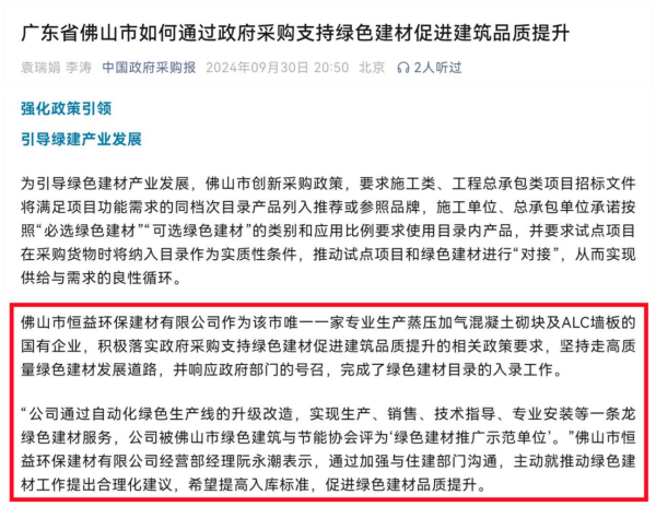 作為佛山市唯一一家專(zhuān)業(yè)生產(chǎn)蒸壓加氣混凝土砌塊及ALC墻板的國(guó)有企業(yè)、“綠色建材推廣示范單位”,電建集團(tuán)下屬公司環(huán)保建材公司在政府采購(gòu)支持綠色建材促進(jìn)建筑品質(zhì)提升的道路上積極作為。近日,《中國(guó)政府采購(gòu)報(bào)》記者對(duì)環(huán)保建材公司進(jìn)行了采訪(fǎng)。在采訪(fǎng)中,環(huán)保建材公司表示,將始終堅(jiān)持走高質(zhì)量綠色建材發(fā)展道路,積極落實(shí)政府采購(gòu)相關(guān)政策要求,響應(yīng)政府部門(mén)的號(hào)召,完成了綠色建材目錄的入錄工作。同時(shí),環(huán)保建材公司不斷加強(qiáng)與住建部門(mén)的溝通,主動(dòng)提出推動(dòng)綠色建材工作的合理化建議,期望提高入庫(kù)標(biāo)準(zhǔn),促進(jìn)提升綠色建材的品質(zhì)。